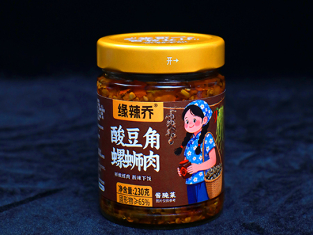 一款将地道湘南风味与现代便捷性相结合的特色即食菜肴。精选脆嫩酸豆角与鲜美螺肉为主料,通过热炒工艺,呈现酸、辣、鲜、香的浓郁滋味与丰富口感